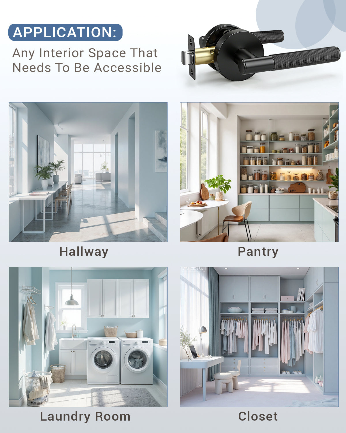 | Application | Interior Doors: Bedroom/Bathroom/Hallway/Closet/Pantry/Rental/Office Exterior Doors: Front Door/Back Door/Garden/Garage |